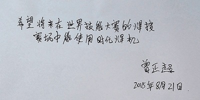 從(cóng)第41屆世界技(jì)能(néng)大(dà)∏®÷✘賽開(kāi)始,焊接項目的(de)培訓和(héσ↔ $)選拔賽一(yī)直使用(yòng)北(♦∞εαběi)京時(shí)代的(de)電(diàn≥♠÷)焊機(jī)。“時(shí)代焊機(jī),中ε♠國(guó)品牌”,“時(shí)代焊機(jī),國(guó)賽用(yò"≠ng)機(jī)”,曆屆大(dà)賽選手對(duì)時(shí)代焊機(jī)非常熟悉,對(duπ♣λì)時(shí)代産品具有(yǒu)特殊的(de)感情。在第43屆世界技(jì)能(néng)大(dà)賽巴西(xī)比賽現(x€δ←iàn)場(chǎng),舉辦方選用(yòng)的(™&Ωde)是(shì)美(měi)國(guó)林(€φlín)肯焊機(jī)。曾正超和(hé)周樹(shù)春教練結合比賽期間(ji' ₽☆ān)的(de)現(xiàn)場(chǎng)感受,和(hé)時(shí)代團隊∏γε 溝通(tōng)了(le)時(shí)代焊機(jī)和(h ♦ é)國(guó)外(wài)品牌産品的(de)性能(né×αng)對(duì)比和(hé)差異,對(duì)代表中國(guó)品牌的(de)時(shí)代焊 Ω機(jī)的(de)發展提出期望,世界冠軍曾正超親筆(bǐ)題寫:“希望将來(lái)在世界技(↑☆↕jì)能(néng)大(dà)賽的(de§® ©)焊接賽場(chǎng)中能(néng)使用(yòng)時(shí)代焊機(jī)”。